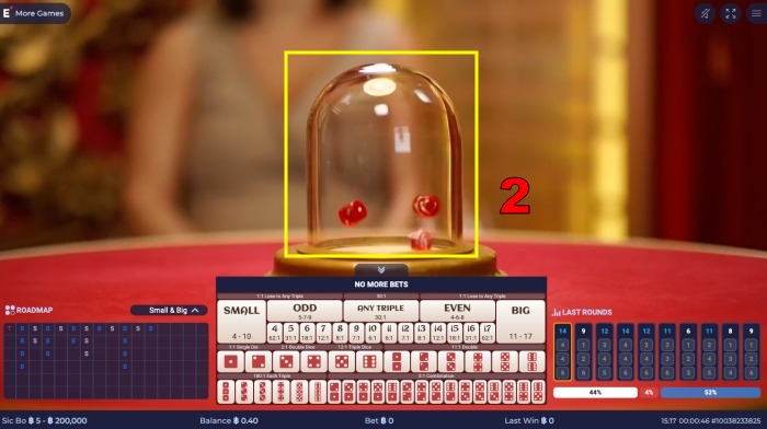2단계: 식보 게임 베팅이 이루어지면 딜러는 주사위를 흔드는 버튼을 누릅니다. 카메라가 주사위 흔드는 모습을 확대해서 보여주기 때문에 이는 식보 게임 게임의 하이라이트로 여겨지며, 플레이어들의 기대감을 더욱 고조시킵니다.