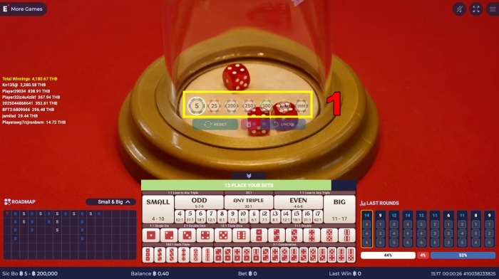 1단계:원하는 베팅 칩 개수를 선택한 후, 16초의 제한 시간 내에 화면에 표시된 베팅판에 칩을 놓으세요. 시간이 다 되면 딜러가 주사위를 흔듭니다.